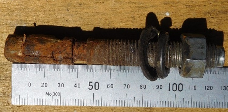- Metal corrosion of the anchor over time, for example where a floor was washed with water and water remains in holes. Unfortunately, corrosion of critical parts of the anchor is hidden while the top of the anchor may be undamaged (refer Figure 2). Refer to the document AEFAC TN15 – Durability of Fasteners for additional guidance.
